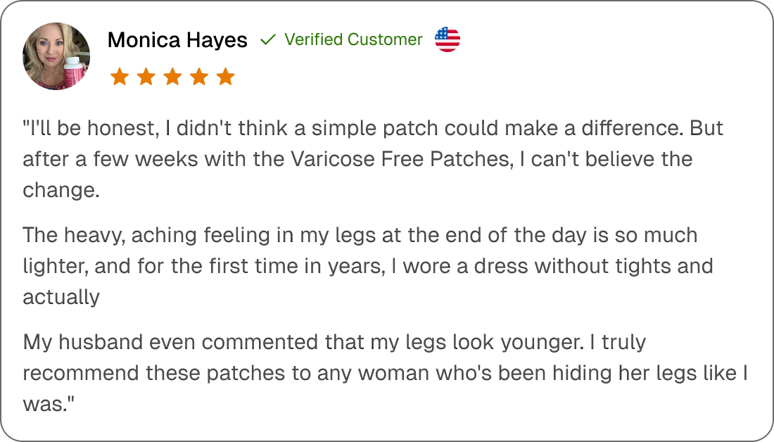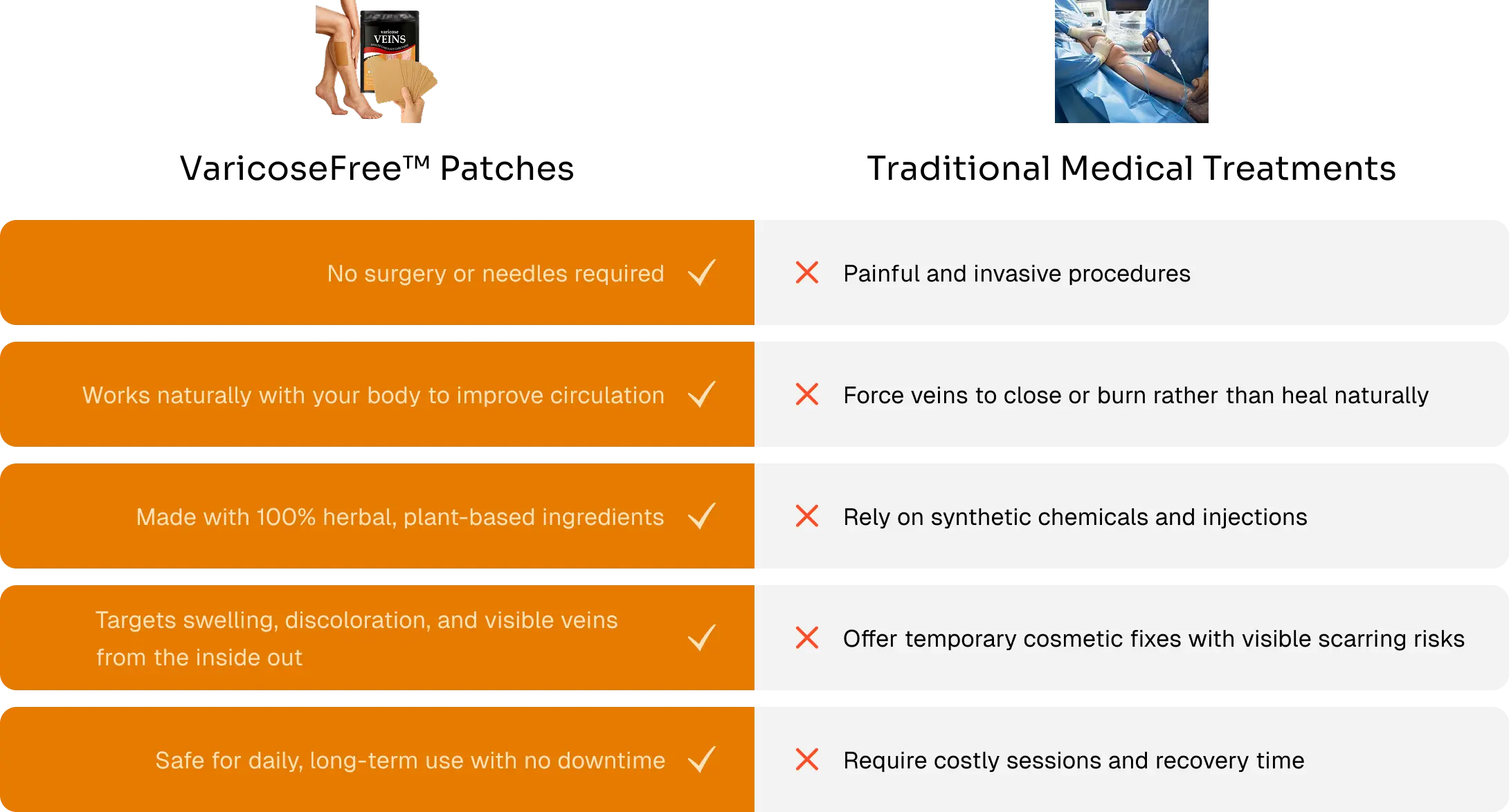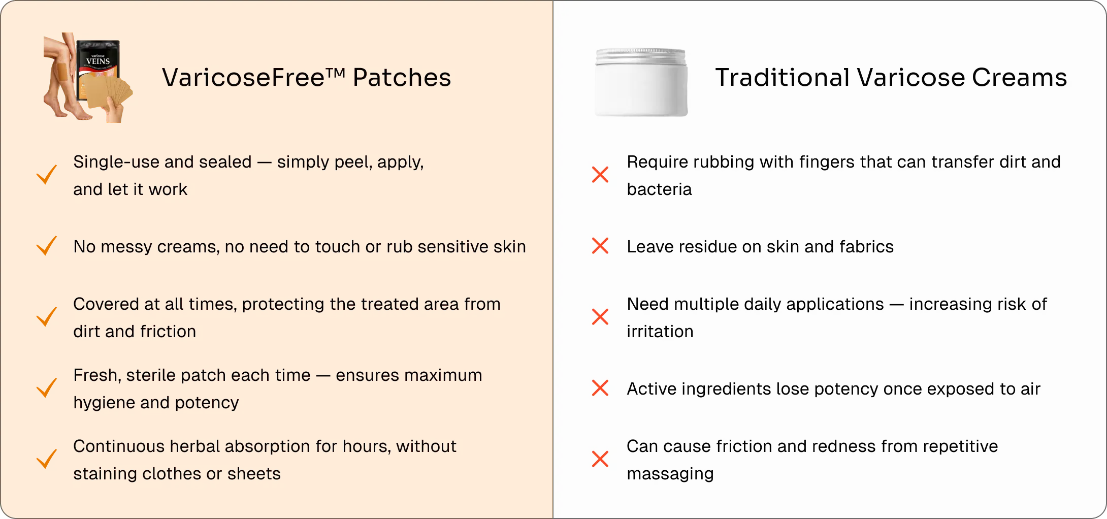 VaricoseFree™ Herbal Patches use a breakthrough Transdermal Herbal Matrix — a modern delivery system inspired by ancient circulation remedies — to deliver natural, vein-supporting compounds directly through your skin, right where relief is needed most.