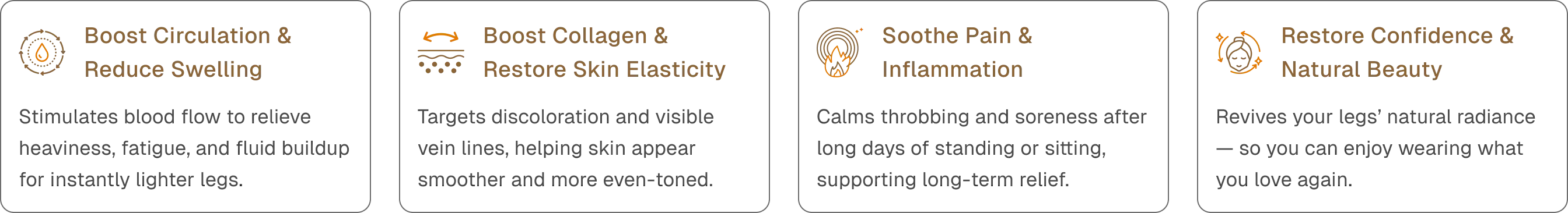 Over consistent use, the ingredients help reduce inflammation, tighten vein walls, and support microcirculation — promoting smoother, more balanced-looking legs while easing discomfort.